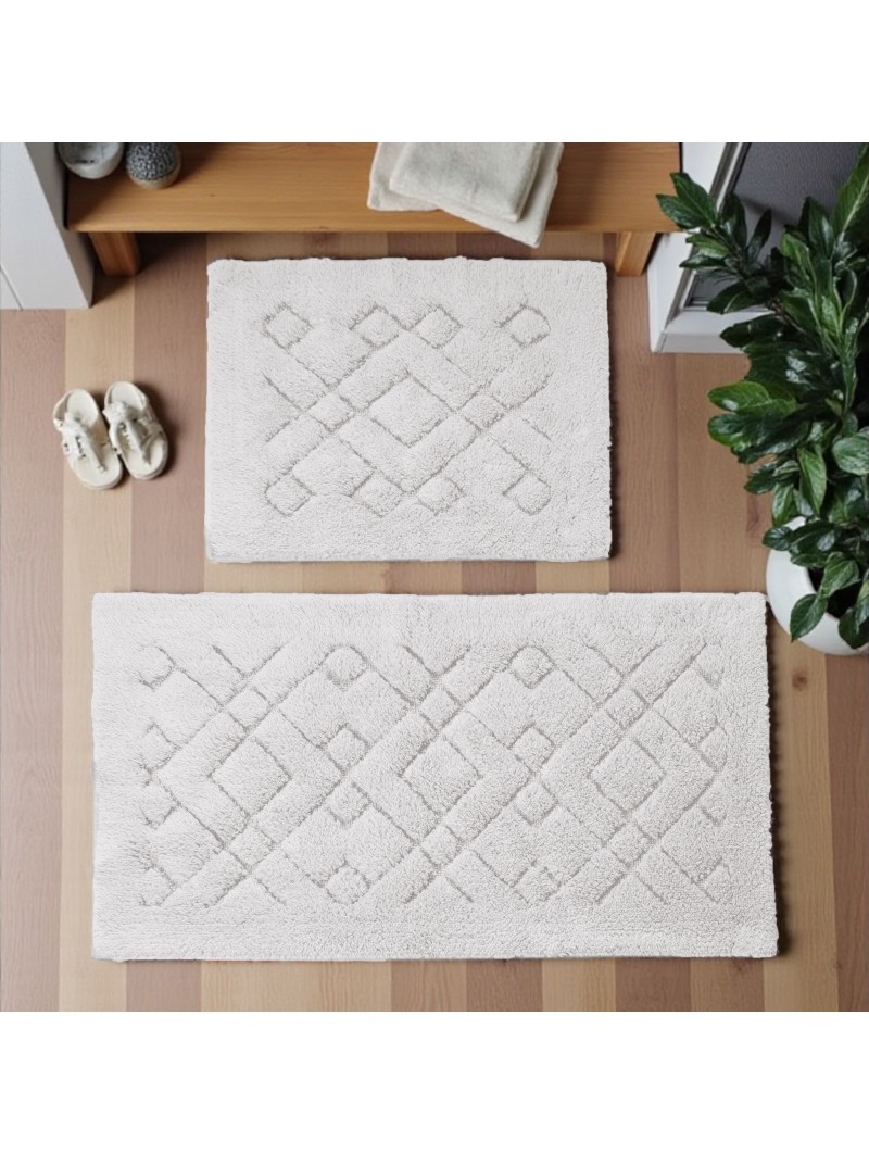 Na komplet składają się dwa dywaniki łazienkowe, w rozmiarze: 60 cm x 100 cm i 50 cm x 60 cm.